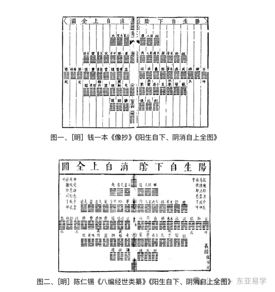 本图于明人钱一本《像抄》、陈明锡《八编经世类纂》中均有收录。本图与陈氏之图右下角均标注有“义图,《像抄》定”,可知该图原出自钱一本《像抄》。后经陈明锡稍加修改,最后被高奣映收录于本书的“采图”部分。陈氏在钱一本《像抄》图式的基础上,主要是在图的上方添加了两端段图解文字,其言:“乾施即消中虚为离,消尽成坤,而坎即息于坤中”“坤受即息中盈为坎,息极成乾,而离即消于坤中”。“乾施坤受”源自《周易・乾・彖传》“大哉乾元,万物资始,乃统天”与《坤・彖传》“至哉坤元,万物资生,乃顺承天”,强调乾为施予、坤为承受的阴阳互动关系。此处陈明锡将坎离二卦加入到乾坤这种“施受”关系中,是以此明本图以乾、坤、坎、离四卦为核心来表述六十四卦内部的阴阳消长规律。